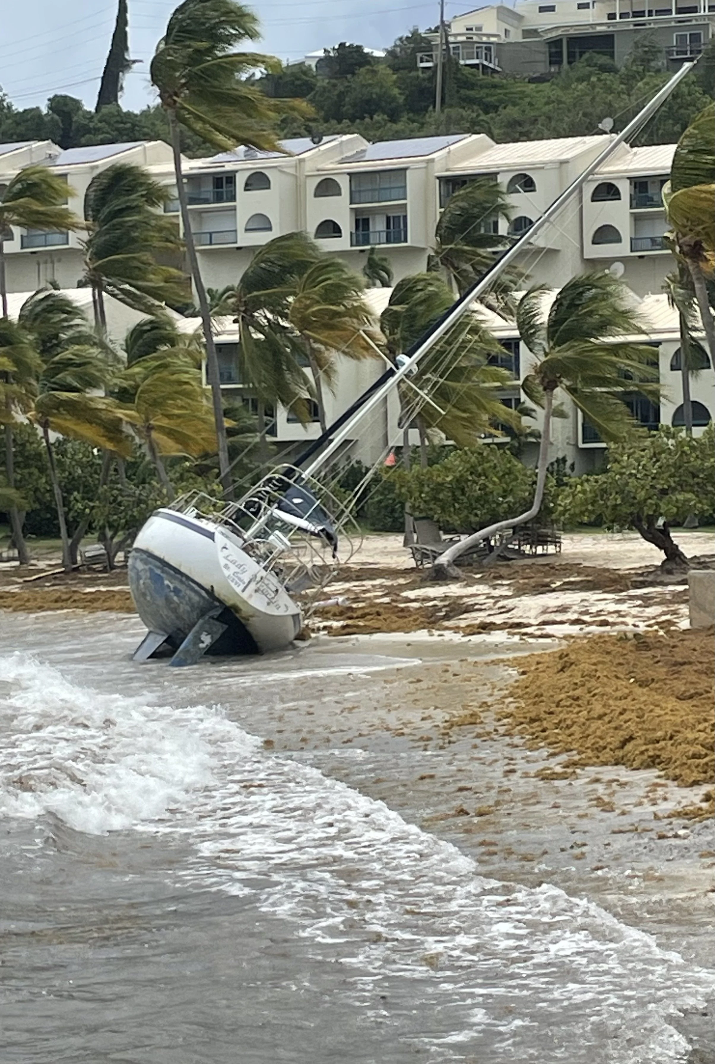 Venturing down to the beach, we saw our minor inconveniences were nothing. Pristine Cowpet Bay beach was buried under huge mounds of sargassum that, until the storm waters deposited it on the beach, was nowhere to be found on Cowpet. Cleanup would take a lot of work. But, even more surprising than the unwelcome seaweed was the sailboat that had broken loose from its moorings and rested on its starboard side in the middle of the beach.